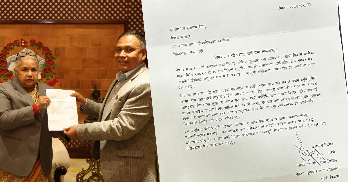 काठमाडौं । ऊर्जा, जलस्रोत तथा सिँचाइमन्त्री कुलमान घिसिङले बुधबार प्रधानमन्त्री सुशीला कार्कीसमक्ष पदबाट राजीनामा दिएका छन् । दलीय राजनीतिमा संलग्न मन्त्रीहरूलाई राजीनामा दिन प्रधानमन्त्रीले दिएको निर्देशन र बढ्दो नैतिक दबाबका बीच घिसिङले राजीनामा दिएका हुन् ।