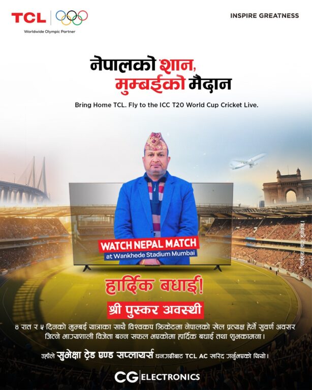 काठमाडौं । टीसीएल नेपालले भारतको मुम्बईस्थित वानखेडे स्टेडियममा आयोजना हुने टी–२० विश्वकप अन्तर्गत नेपाल राष्ट्रिय क्रिकेट टोलीको खेल प्रत्यक्ष हेर्न पाउने विशेष उपभोक्ता क्याम्पेनका विजेता सार्वजनिक गरेको छ।