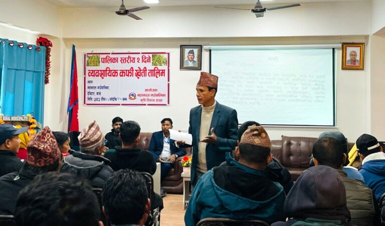 धुलिखेल । काभ्रेपलाञ्चोकको डाँडापारिस्थित महाभारत गाउँपालिकाका कफीखेती गर्दै आएका किसानहरूलाई ‘व्यावसायिक कफीखेती प्रविधि तालिम’ प्रदान गरिएको छ ।