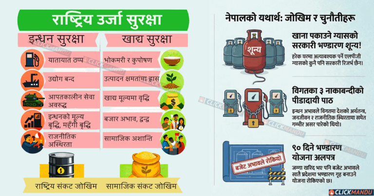 ‘झन् नेपाल भूपरिवेष्टित मुलुक हो, तीनतर्फबाट भारत र एकतर्फबाट चीनले घेरेको मुलुकले इन्धनलाई राष्ट्रिय ऊर्जा सुरक्षाको रूपमा हेरेर त्यही अनुसार योजना र पर्याप्त परिमाणमा भण्डारण गर्ने भण्डार गृहको संरचना तयार गरी समय छँदै कार्यान्वयनमा ल्याउन अति आवश्यक छ,’ ती अधिकारीले भने ।