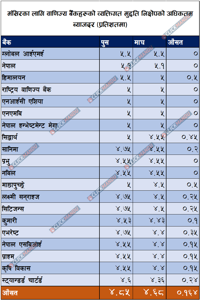 हिमालयन, राष्ट्रिय वाणिज्य, एनआईसी एशिया, एनएमबी र नेपाल इन्भेष्टमेन्ट मेगा बैंकले व्यक्तिगत मुद्दती निक्षेपको अधिकतम ब्याजदर माघको लागि ५ प्रतिशत प्रस्ताव गरेका छन् । पुसमा ५.५ प्रतिशत रहेको हिमालयन बैंकले माघमा ०.५ प्रतिशत बिन्दुले घटाएर ५ प्रतिशत बनाएको हो ।
