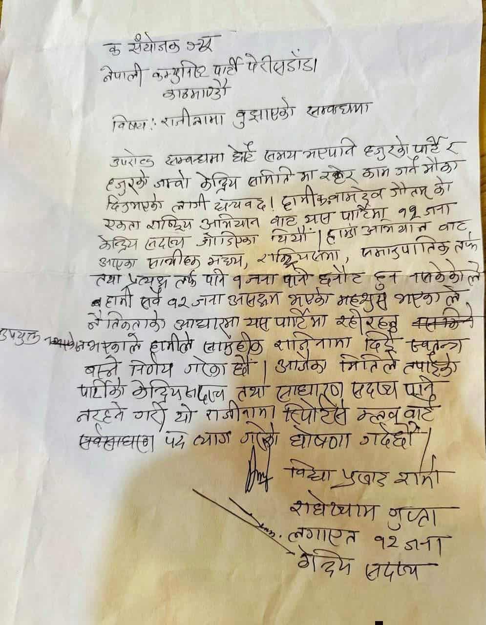 राजीनामा दिनेहरूमा विद्याप्रसाद शर्मा, राधेश्याम गुप्ता लगायतका नेताहरू रहेका छन् ।