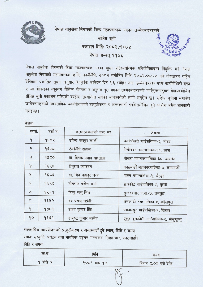 पर्यटन मन्त्रालयले भने शुक्रबार साँझ नेपाल वायुसेवा निगमको रिक्त महाप्रबन्धक पदका लागि उम्मेदवारहरूको संक्षिप्त सूची सार्वजनिक गरेको छ । मन्त्रालयले १६ जना आवेदकमध्येबाट १० जनाको संक्षिप्त सूची सार्वजनिक गरेको हो ।