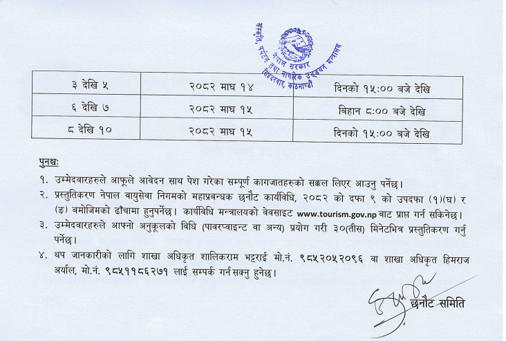 पर्यटन मन्त्रालयले सार्वजनिक गरेको संक्षिप्त सूचीमा उपेन्द्रबहादुर कार्की, टंकनिधि दाहाल, डा. दीपकप्रसाद बास्तोला, दीपुराज ज्वारचन, डा. भीमबहादुर चन्द, योगराज कँडेल शर्मा, विष्णुबाबु मिश्र, वेदप्रसाद उप्रेती, संजयकुमार सिंह र सन्तुष्टकुमार बस्नेत छन् । यी आवेदकहरूलाई माघ १४ गते र १५ गते बिहान ८ बजे र ३ बजे आफ्नो प्रस्तुतीकरणसहित अन्तर्वार्ताको लागि बोलाएको छ ।
