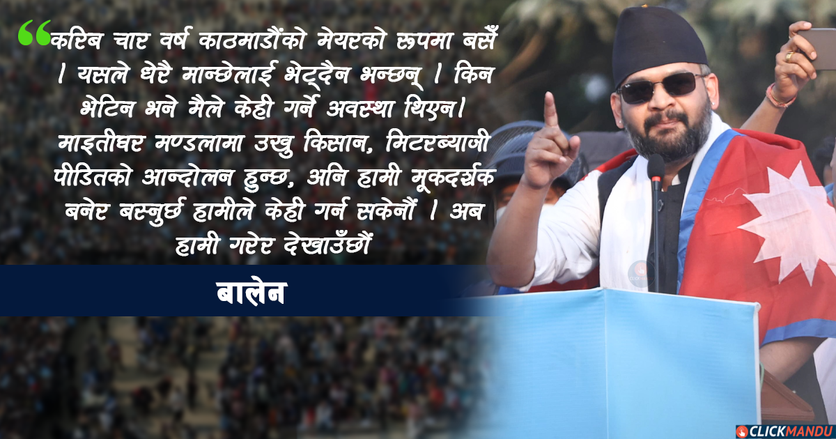 आज लगभग चार वर्ष भयो काठमाडौँको मेयरका रूपमा बसेको, मान्छेले भन्छन् यसले मान्छेलाई भेट्दै भेट्दैन । त्यहीँ सधैँ, त्यहीँ सधैँ माइतीघर मण्डलामा उखु किसानको आन्दोलन हुन्छ, मिटरब्याजी पीडितको आन्दोलन हुन्छ, अनि हामी मूकदर्शक बनेर बस्छौँ हामी केही गर्न सक्दैनौँ ।