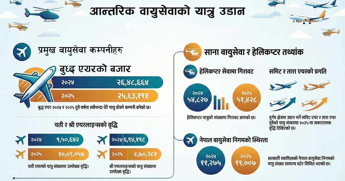 हेलिकप्टर सेवा प्रदायकको एकमुष्ट यात्रु सेवा र नेपाल वायुसेवा निगमको पनि यात्रु क्षमता घटेको छ । निगमका ११ हजार २७५ यात्रु सन् २०२४ मै थिए भने सन् २०२५ मा यसको यात्रु क्षमता घटेको छ । यसको यात्रु सेवा ११ हजार ७ जना मात्रै छ ।