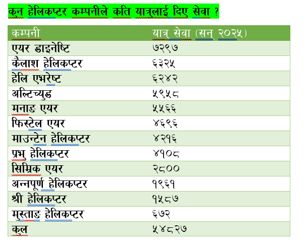 तथ्यांक अनुसार गत वर्ष सन् २०२४ मा ५१ हजार यात्रुलाई सेवा दिएका हेलिकप्टर कम्पनीले यो वर्ष ५४ हजार ८२७ लाई सेवा दिएका छन् । सेवाका हिसाबले गत वर्ष भन्दा यो वर्ष सन् २०२५ मा ३ हजार १२२ यात्रु बढेका छन् । यो संख्या गत वर्षको तुलनामा ६ प्रतिशतले मात्रै बढी हो ।