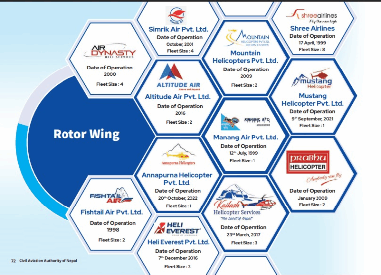 दुई वटा हेलिकप्टर भएको माउन्टेन हेलिकप्टरले ४ हजार २१६, दुई वटा हेलि भएको अर्को हेलिकप्टर कम्पनी प्रभुले ४ हजार १०८, चार वटा हेलि भएको सिम्रिकले २ हजार ८ सय र एक मात्रै हेलिकप्टर उडाइरहेको अन्नपूर्ण हेलिकप्टरले १ हजार ९६१ उडान गरेको पनि प्राधिकरणको तथ्यांकले देखाएको छ ।
