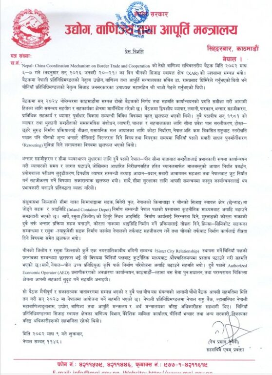 काठमाडौं। नेपाल–चीन सीमा व्यापार तथा सहयोग समन्वय संयन्त्र (नेपाल–चाइना कोअर्डिनेशन मेकानिजम अन बोर्डर ट्रेड एण्ड कर्पोरेशन) को तेस्रो वाणिज्य सचिवस्तरीय बैठक चीनको सिजाङ स्वायत्त क्षेत्रको राजधानी ल्हासामा सम्पन्न भएको छ ।