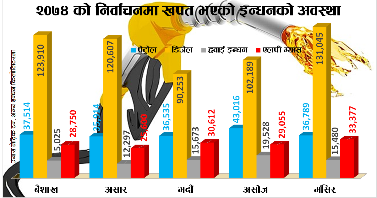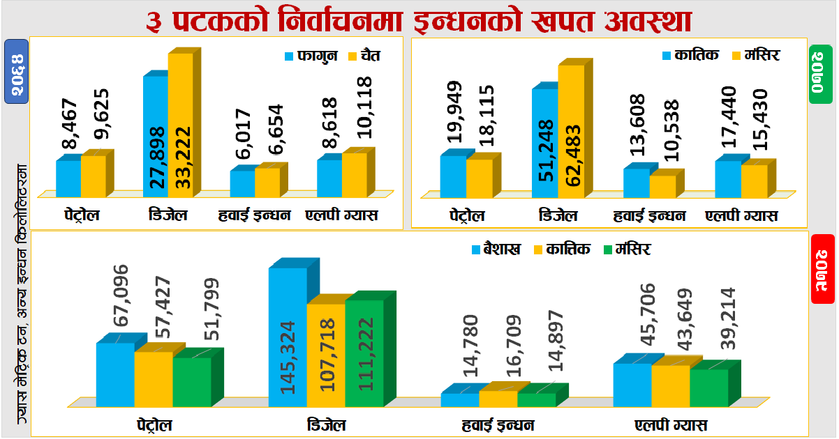 यसरी हेर्दा स्थानीय तहको निर्वाचनका कारण त्यो बेला दैनिक ४ हजार ८ सय ४४ किलोलिटर डिजेल र पेट्रोल २ हजार २ सय ३६ किलोलिटर खपत भएको पाइन्छ ।