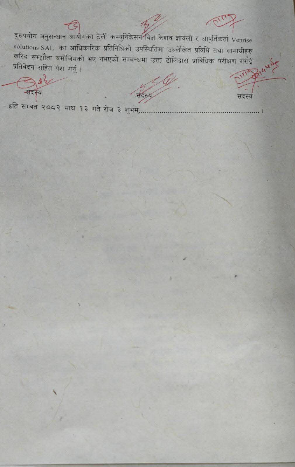 त्रिभुवन विश्वविद्यालय, पुल्चोक इन्जिनियरिङ क्याम्पसका वरिष्ठ इन्जिनियरको संयोजकत्वमा टेलिकम्युनिकेसन एण्ड इलेक्ट्रोनिक्स विषयका विज्ञ प्राध्यापकहरू, केन्द्रीय प्रहरी अनुसन्धान ब्यूरोका विषय विज्ञ सदस्य, अख्तियार दुरुपयोग अनुसन्धान आयोगका टेलिकम्युनिकेसन विज्ञ केशव झावली, आपूर्तिकर्ता कम्पनी ‘भेन्राइज सोलुसन्स’ का आधिकारिक प्रतिनिधि रहेको टोली गठनको आदेश अदालतले गरेको छ ।