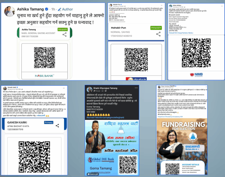 स्वतन्त्र तथा विभिन्न दलका उम्मेदवारहरूले चुनाव प्रचारप्रसारका लागि भन्दै आफ्नो व्यक्तिगत बैंक खाताको क्यूआर कोड फेसबुक लगायतका प्लेटफर्ममा राखेर पैसा संकलन गर्न थालेपछि नेपाल राष्ट्र बैंकले चुनावी प्रयोजनाका लागि बेग्लै खाता खोल्न निर्देशन दिइसकेको छ ।
