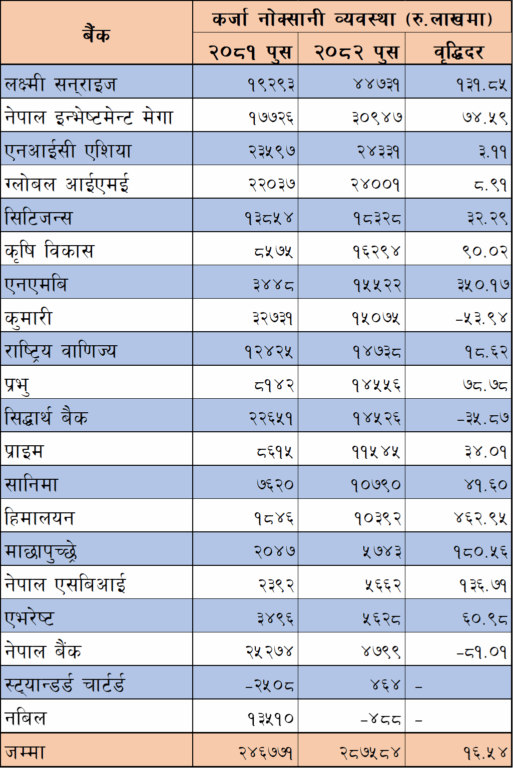 ग्लोबल आईएमई बैंकले कर्जा नोक्सानी व्यवस्थामा छुट्याएको रकम ८.९१ प्रतिशतले बढेर २ अर्ब ४० करोड १ लाख रुपैयाँ पुग्दा सिटिजन्स बैंकको ३२.२९ प्रतिशतले बढेर १ अर्ब ८३ करोड २८ लाख रुपैयाँ छ । कृषि विकास बैंकको कर्जा नोक्सानी व्यवस्थामा छुट्याएको रकम ९०.०२ प्रतिशतले बढेर १ अर्ब ६२ करोड ९४ लाख रुपैयाँ पुगेको छ । त्यस्तै एनएमबि बैंकको कर्जा नोक्सानी व्यवस्थाको रकम ३५० प्रतिशतले बढेर १ अर्ब ५५ करोड २२ लाख रुपैयाँ र कुमारी बैंकको भने ५३.९४ प्रतिशतले घटेर १ अर्ब ५० करोड ७५ लाख रुपैयाँमा झरेको हो ।