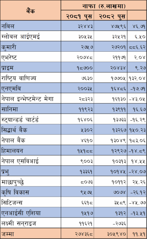कर्जा नोक्सानी व्यवस्थामा वृद्धि हुँदा पनि नाफा ११.५१ प्रतिशतले बढेको छ । नबिल, ग्लोबल आईएमई, कुमारी, एभरेष्ट, प्राइम कमर्सियल लगायतका बैंकले नाफा बढाउँदा लक्ष्मी सनराइज बैंकले भने नोक्सानीमा रहेको वित्तीय विवरण प्रकाशित गरेको छ।