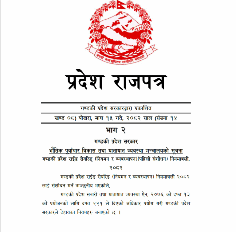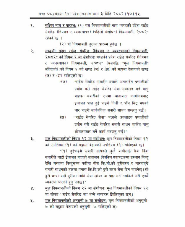 गण्डकी प्रदेश सरकारले ‘गण्डकी प्रदेश राईड सेयरिङ (नियमन र व्यवस्थापन) नियमावली, २०८२’ संशोधन गरेको छ ।