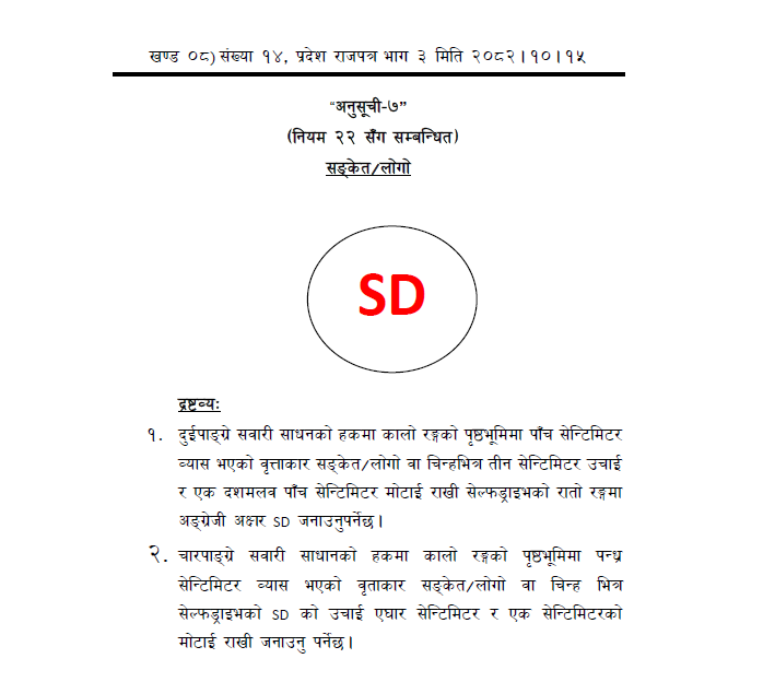 यसैगरी चार पाङ्ग्रे राइड रेयरिङ् सेवा दिने सवारी साधनको हकमा कालो रङको पृष्टभूमिमा पाँच सेन्टिमिटर व्यास भएको वृताकार संकेत, लोगो वा चिन्हभित्र सेल्फ ड्राइभको अंग्रेजी अक्षरमा एसडी को उचाँई ११ सेन्टिमिटर र एक सेन्टिमिटरको मोटाईमा राख्नुपर्ने नियमावलीमा उल्लेख छ ।