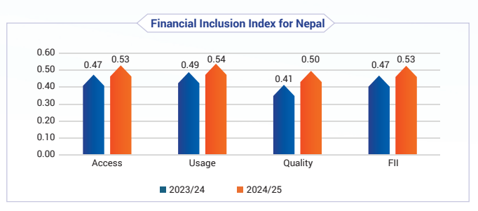 राष्ट्र बैंकले सार्वजनिक गरेको प्रतिवेदन अनुसार आर्थिक वर्ष २०२४/२५ मा नेपालको समग्र वित्तीय समावेशीकरण सूचकांक ०.५३ पुगेको छ ।