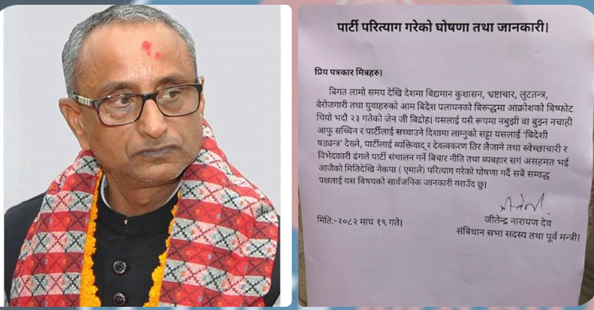 काठमाडौं । नेकपा एमालेका पूर्व संविधानसभा सदस्य तथा पूर्व मन्त्री जितेन्द्र देवले पार्टी परित्याग गरेका छन् ।