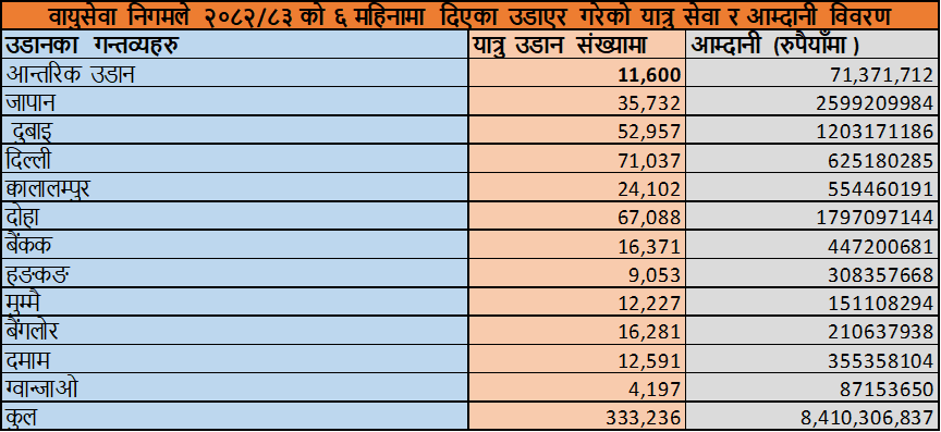 नेपाल वायुसेवा निगमका जहाज नियमित उडान गरिरहेका र कुनै पनि मर्मतमा नगएकोले गत वर्षकाे तुलनामा चालु आर्थिक वर्ष २०८२/८३ को पहिलो छ महिनामा यात्रु सेवा र आम्दानी दुबै बढेको छ । निगमले यो समयमा ३ लाख ३३ हजार यात्रुलाई देश विदेशका विभिन्न गन्तव्यवमा पुर्याउँदा यसले ८ अर्ब ४१ करोड रुपैयाँ आम्दानी गरेको देखिएको छ ।