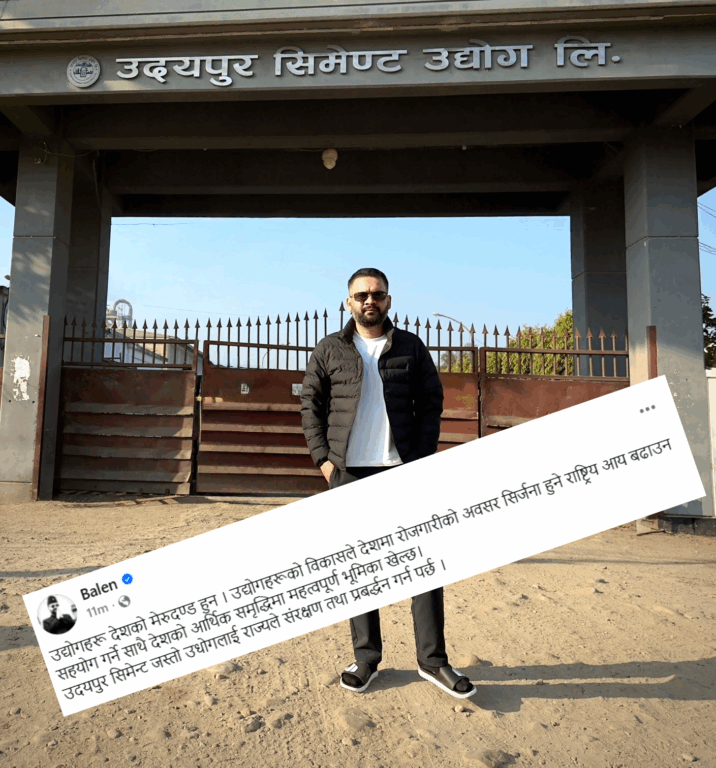 उदयपुरस्थित उदयपुर सिमेन्ट कारखाना लिमिटेडको मुख्य गेटमा तस्विर खिंचाएर सामाजिक सञ्जालमा सार्वजनिक गर्दै बालेनले उद्योग कलकारखानाले मुलुकको आर्थिक समृद्धिमा महत्वपूर्ण भूमिका खेल्ने गरेकाले उदयपुर सिमेन्टजस्ता उद्योगको राज्यले संरक्षण र सम्बद्र्धन गर्नुपर्ने औल्याएका छन् ।
