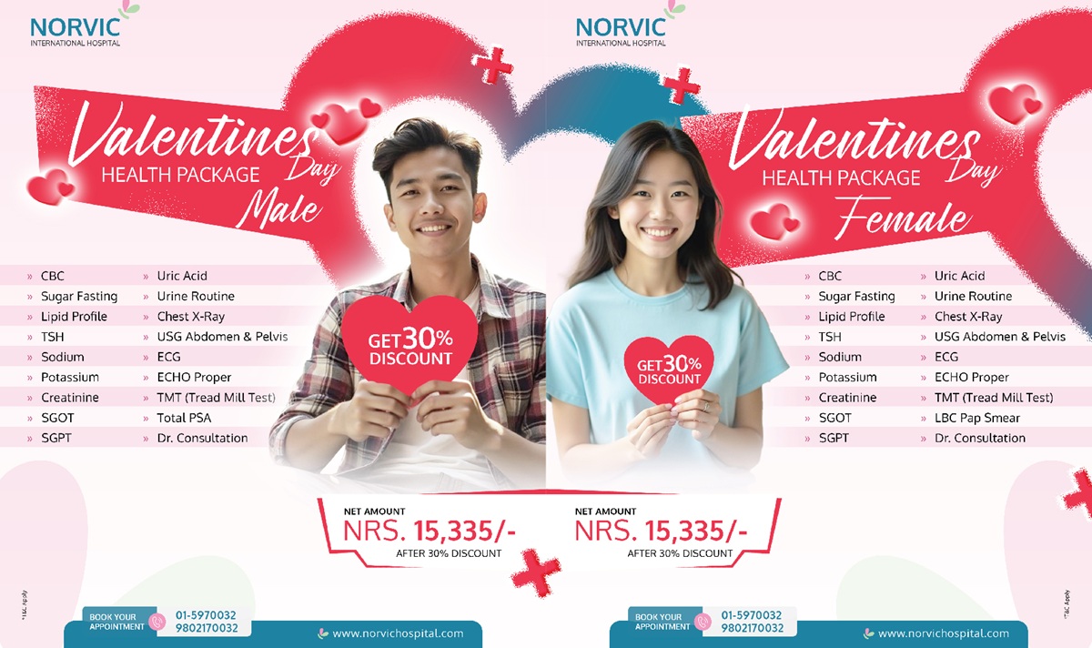 काठमाडौं । थापाथलीस्थित नर्भिक इन्टरनेसनल हस्पिटलले ‘भ्यालेन्टाइन डे’ को अवसरमा ३० प्रतिशत छुटसहितको विशेष हेल्थ प्याकेज ल्याएको छ ।