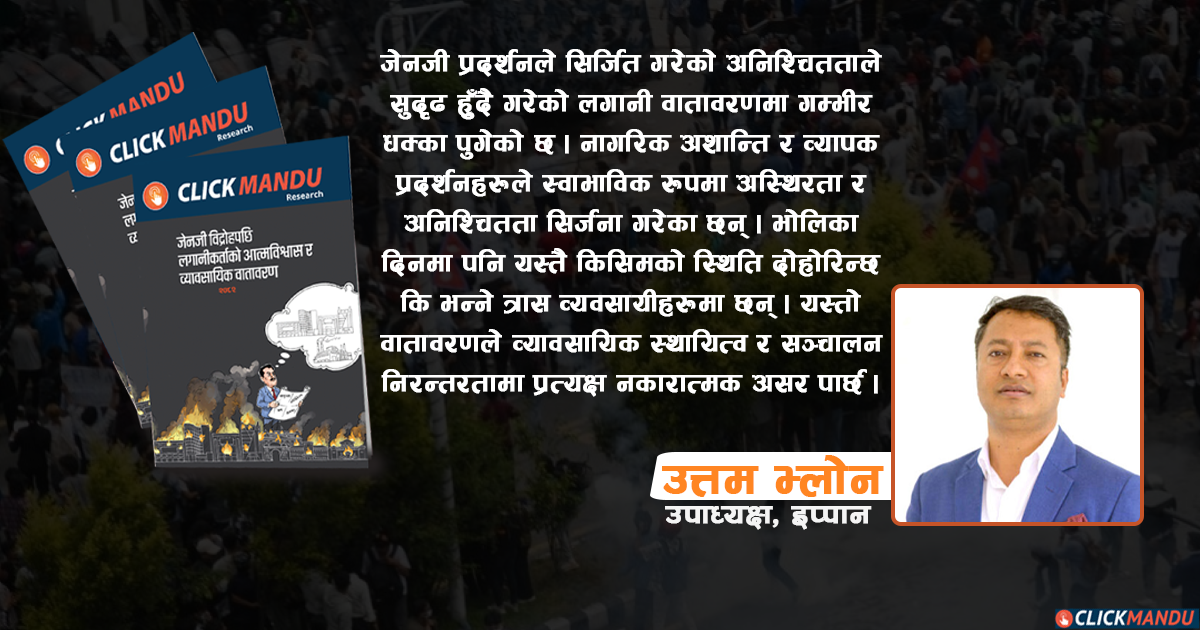 (प्रस्तुत लेख ‘जेनजी विद्रोहपछि लगानीकर्ताको आत्मविश्वास र व्यावसायिक वातावरण’ अध्ययनका क्रममा सोधिएका प्रश्नहरुमा इप्पान उपाध्यक्ष उत्तम भ्लोनले दिएको जवाफका आधारमा तयार पारिएको हो ।)