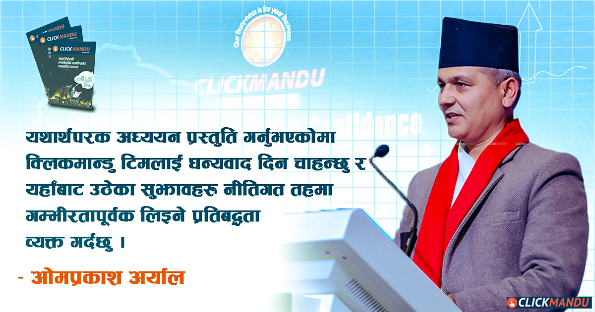 कतिपय विषयवस्तुहरु गृह मन्त्रालयसँग सम्बन्धित छन् ती विषयमा पनि हामीले मन्त्रालयमा गएर छलफल गर्नेछौं त्यति म आश्वस्त पार्न चाहन्छु । र अन्त्यमा, यथार्थपरक अध्ययन प्रस्तुति गर्नुभएकोमा क्लिकमान्डु टिमलाई धन्यवाद दिन चाहन्छु र यहाँबाट उठेका सुझावहरु नीतिगत तहमा गम्भीरतापूर्वक लिइने प्रतिबद्धता व्यक्त गर्दछु ।