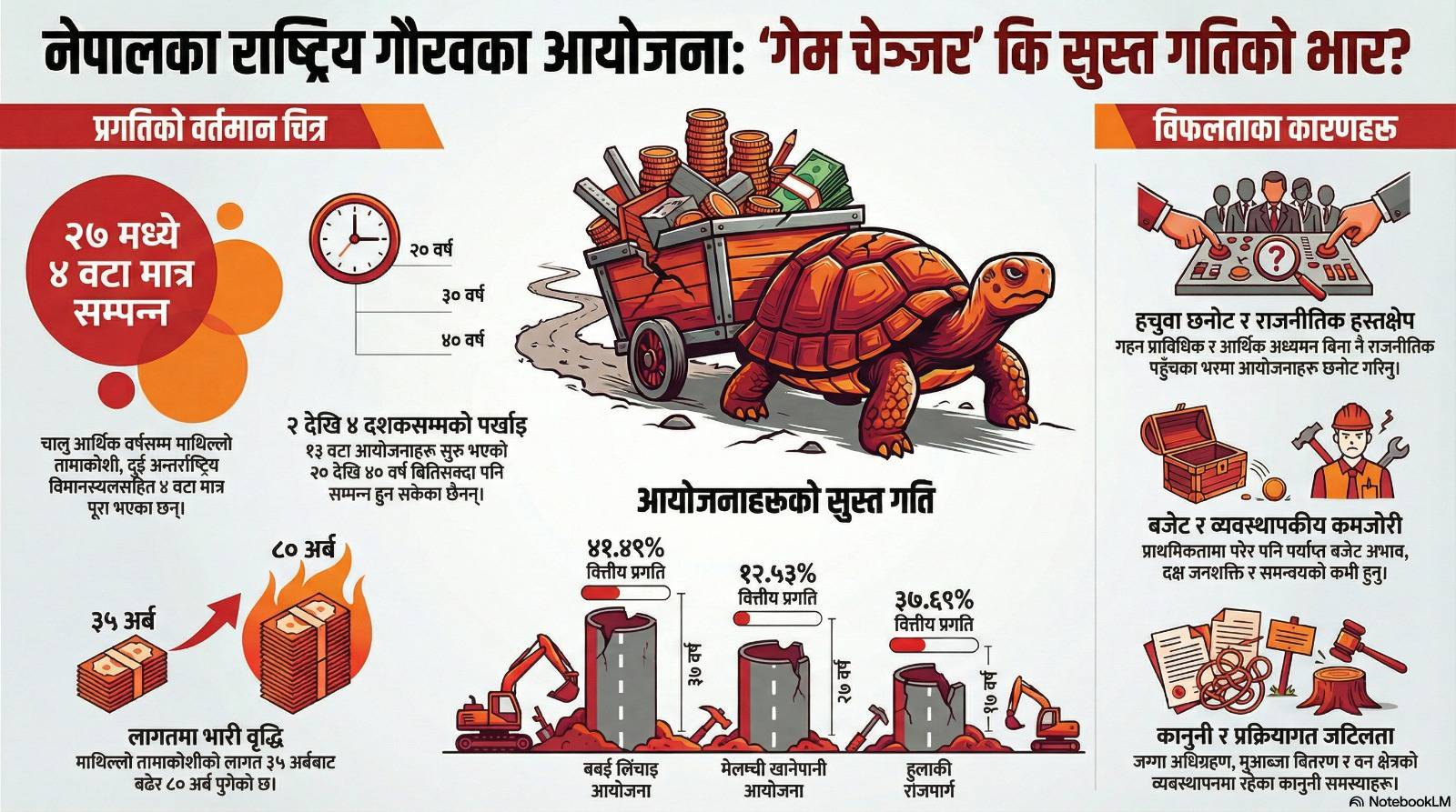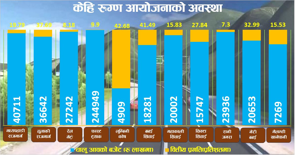 चालु आर्थिक वर्षको पुस महिनासम्ममा २७ वटामध्ये पोखरा क्षेत्रीय अन्तर्राष्ट्रिय विमानस्थल, गौतमबुद्ध अन्तर्राष्ट्रिय विमानस्थल, माथिल्लो तामाकोशी जलविद्युत आयोजनासहित ४ वटा सम्पन्न भएर अहिले पनि २३ वटा आयोजना कछुवाको चालमा घस्रिरहेका छन् ।