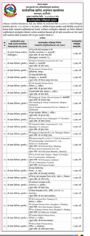 सार्वजनिक सूचना अनुसार काठमाडौंको पिएनडि शेर्पा कन्स्ट्रक्सन, पवित्र मल्टिपल कन्स्ट्रक्सन, भक्तपुरको ओम गणेश निर्माण सेवा, काठमाडौंको च्यांगरासी निर्माण सेवा, धादिंगको डीपी कँडेल निर्माण सेवा र पृथ्वी निर्माण सेवा, काठमाडौंको हिमदुंग एण्ड थोकर, हिरा एण्ड नमिता जेभी, हिमदुँग एण्ड थोकर कन्स्ट्रक्सन, धादिंगको पूजा कन्स्ट्रक्सन, चितवनको चिता एण्ड सल्लेरी एसोसिएसन, नुवाकोटको सियोन निर्माण सेवालगायतका कम्पनीहरुलाई सरकारले एक वर्षको लागि कालोसूचीमा राखेको छ ।