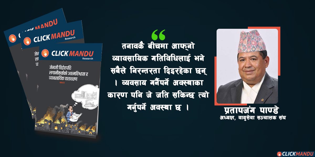 कैलाश हेलिकप्टरका सञ्चालक प्रतापजंग पाण्डे वायुसेवा सञ्चालक संघका अध्यक्ष पनि हुन् । व्यवसायिक क्षेत्रमा उनको ३ दशक लामो अनुभव छ । उनी भदौ २३ र २४ को जेनजी विद्रोहका क्रममा निजी क्षेत्रमाथि भएको आक्रमणले समग्र निजी क्षेत्रको आत्मविश्वासमा ठूलो धक्का पुर्‍याएको बताउँछन् । जेनजी विद्रोहका कारण व्यवसायीले भोग्नुपरेको आर्थिक तथा भौतिक क्षति र लगानीको खस्कँदो वातावरणबारे पाण्डेको अनुभव र विश्लेषण यहाँ प्रस्तुत गरिएको छ । प्रस्तुत छ, ‘जेनजी विद्रोहपछि लगानीकर्ताको आत्मविश्वास र व्यावसायिक वातावरण’ सम्बन्धी अध्ययनका लागि व्यवसायी पाण्डेसँग गरिएको कुराकानीको सम्पादित अंश: