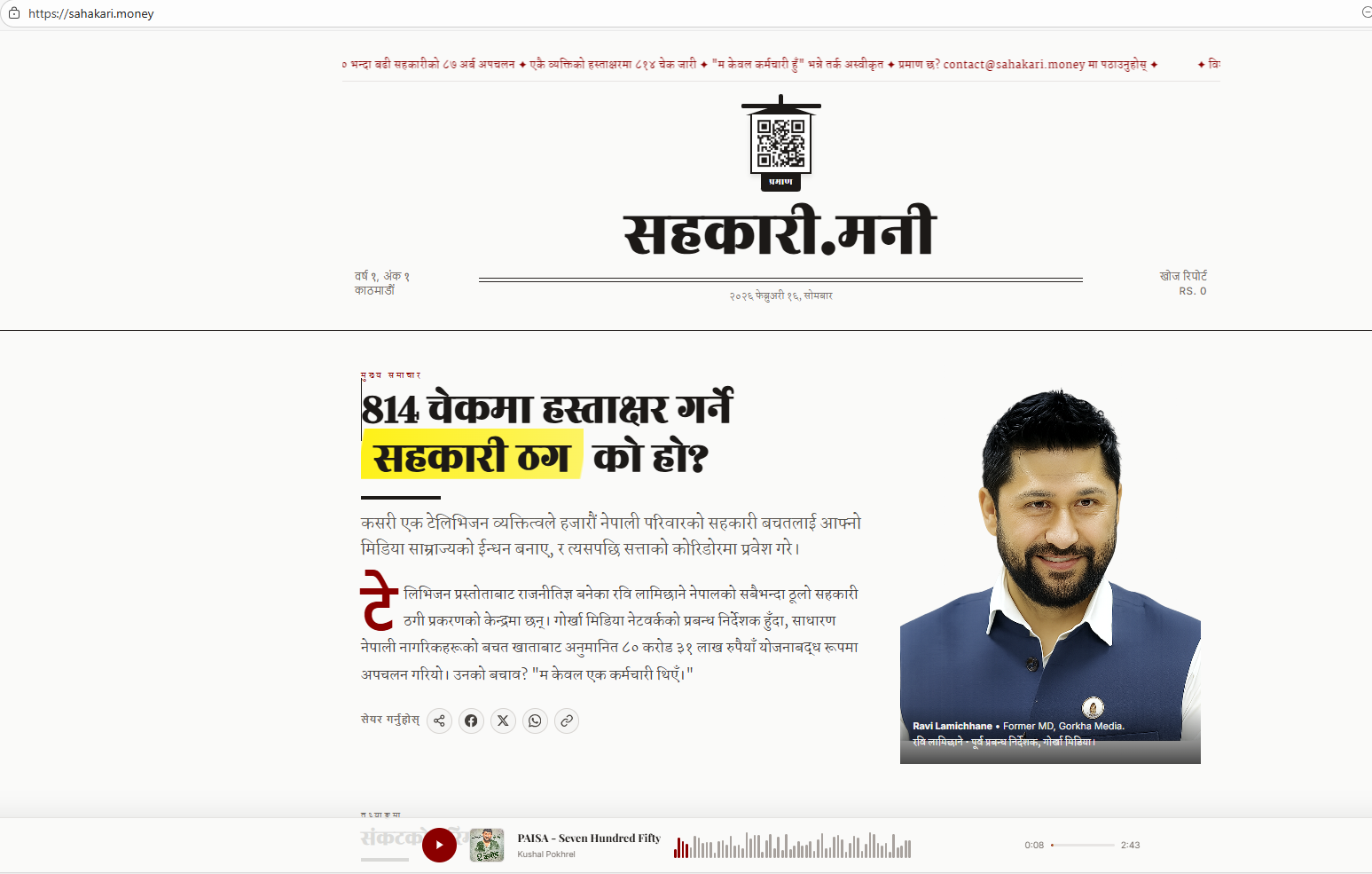 ‘टेलिभिजन प्रस्तोताबाट राजनीतिज्ञ बनेका रवि लामिछाने नेपालको सबैभन्दा ठूलो सहकारी ठगी प्रकरणको केन्द्रमा छन्। गोर्खा मिडिया नेटवर्कको प्रबन्ध निर्देशक हुँदा, साधारण नेपाली नागरिकहरूको बचत खाताबाट अनुमानित ८० करोड ३१ लाख रुपैयाँ योजनाबद्ध रूपमा अपचलन गरियो । उनको बचाउ – म केवल एक कर्मचारी थिएँ ।’ डोमेनको सुरुमा लेखिएको छ ।