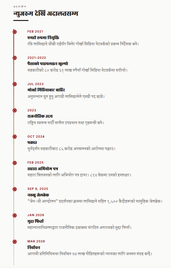 यो वेबसाइटमागोर्खा मिडियादेखि आगामी निर्वाचनको तयारीसम्म लामिछानेको यात्रालाई यसरी प्रस्तुत गरिएको छः