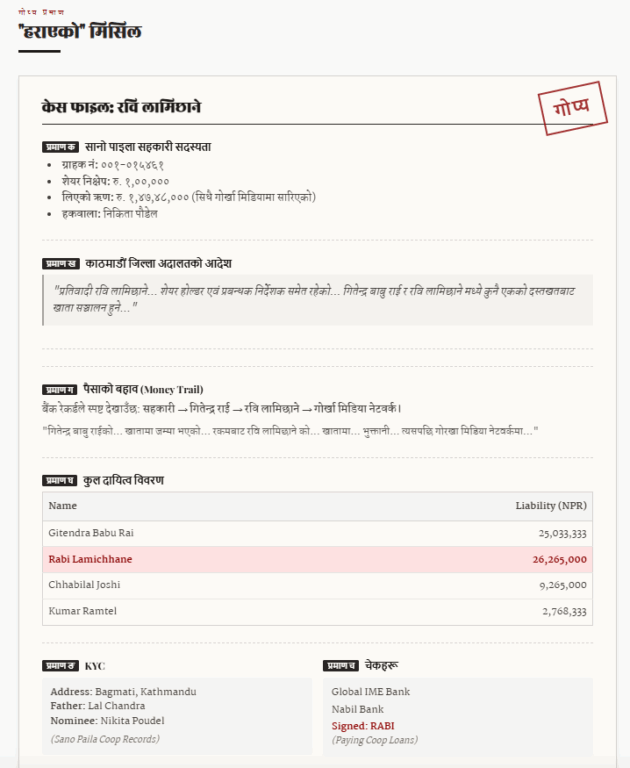 वेबसाइटमा उल्लेखित विवरण अनुसार पोखराको सूर्यदर्शन सहकारीबाट ३० करोड रकम सिधै गोर्खा मिडिया नेटवर्कमा पठाइएको छ । बुटवलको सुप्रिम सहकारीबाट १५ करोडभन्दा बढी रकम गार्खा मिडियामा गएको उल्लेख छ । जसमा लामिछानेको व्यक्तिगत नाममा २० लाख रुपैयाँ ऋण समेत देखाइएको छ । चितवनको सहारा चितवन सहकारी सहकारीबाट ५२ करोड गोर्खा मिडियामा सारिएको त्यहाँ उल्लेख छ । साथै लामिछानेको एकल हस्ताक्षरमा ८१४ वटा चेक काटिएको विवरण पनि राखिएको छ ।