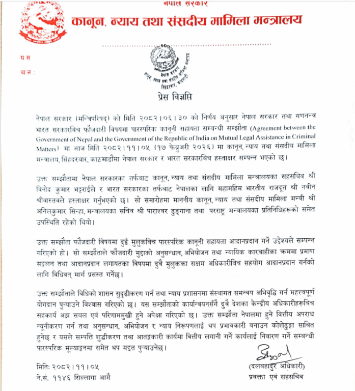 कानून, न्याय तथा संसदीय मामिला मन्त्रालयका प्रवक्ता दलबहादुर अधिकारीका अनुसार नेपाल र भारत सरकारबीच मंगलबार यो सम्झौता भएको हो ।