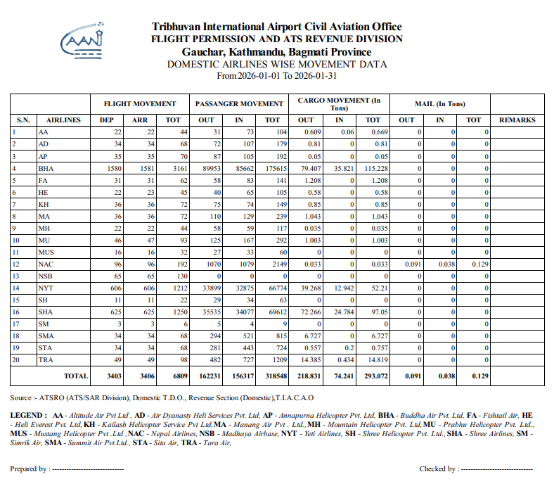 यी वायुसेवामध्ये नेपाल एयरलाइन्सले जनावरीमा ३ सय वटा उडानमार्फत ५४ हजार ३५८ यात्रुलाई सेवा दिएको छ । निगमले काठमाडौंबाट २७ हजार ३७८ यात्रुलाई विदेश लैजाना नेपालमा २७ हजार १६ यात्रुलाई भित्र्याएको छ ।