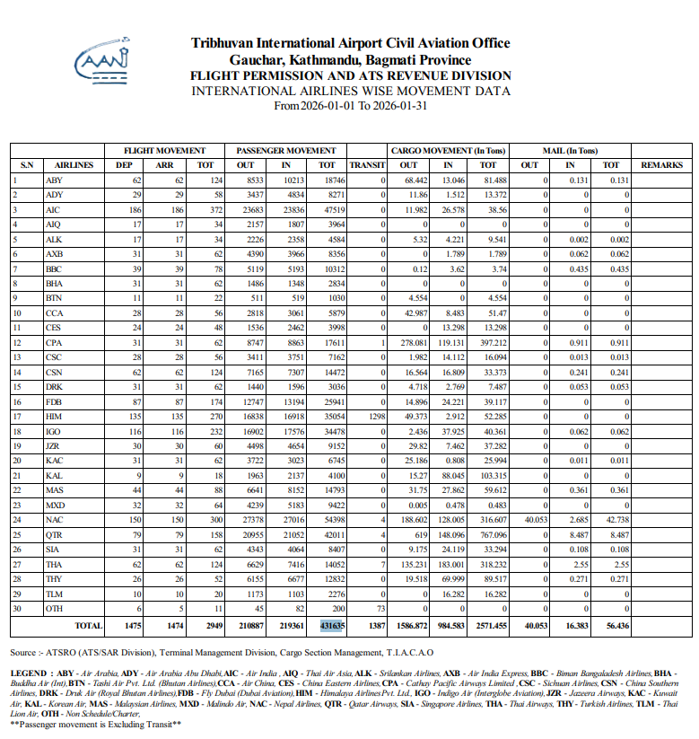 त्रिभुवन अन्तर्राष्ट्रिय विमानस्थल कार्यालयले बुधबार सार्वजनिक गरेको सन् २०२६ को जनावरीको तथ्यांक अनुुसार नेपालबाट २ लाख १० हजार यात्रु विदेश यात्रामा जाँदा विभिन्न अन्तर्राष्ट्रिय गन्तव्यबाट नेपाल आउने यात्रुको संख्या भने २ लाख १९ हजार रहेको देखिएको छ ।