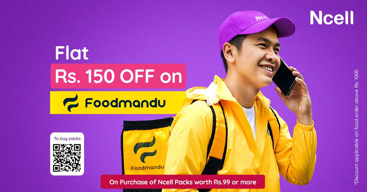 फागुन ५ देखि सञ्चालनमा आएको यो अफरमा, रु. ९९ वा सोभन्दा बढी मुल्य रहेका अफरमा समावेश कुनै पनि एनसेल प्याकको खरिदमा ग्राहकहरूले रु. १५० छुटको कुपन प्राप्त गर्दछन् । यो कुपन फुडमाण्डुमा रु. १,००० वा सोभन्दा बढी मूल्यका विभिन्न परिकारका अर्डरमा प्रयोग गर्न सकिन्छ ।