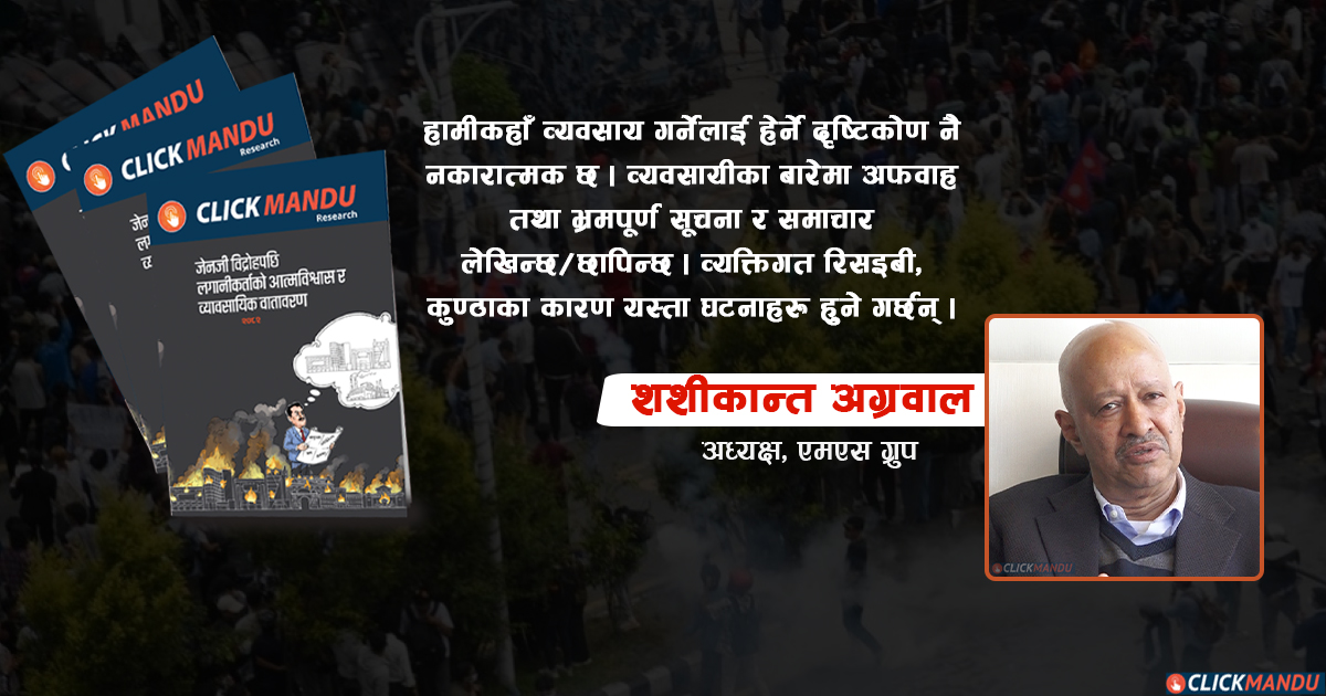 शशीकान्त अग्रवाल एमएस ग्रुपका अध्यक्ष हुन् । व्यावसायिक क्षेत्रमा उनको ३ दशकभन्दा लामो अनुभव छ । उनी भदौ २३ र २४ को जेनजी विद्रोहका क्रममा निजी क्षेत्रमाथि भएको आक्रमणले समग्र निजी क्षेत्रको आत्मविश्वासमा ठूलो धक्का पुर्याएको बताउँछन् । जेनजी विद्रोहका कारण व्यवसायीले भोग्नुपरेको आर्थिक तथा भौतिक क्षति र लगानीको खस्कँदो वातावरणबारे अग्रवालको अनुभव र विश्लेषण यहाँ प्रस्तुत गरिएको छ।
