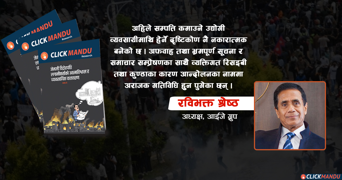 रविभक्त श्रेष्ठ आईजे ग्रुपका अध्यक्ष हुन् । व्यावसायिक क्षेत्रमा उनको ३ दशकभन्दा लामो अनुभव छ । उनी भदौ २३ र २४ को जेनजी विद्रोहका क्रममा निजी क्षेत्रमाथि भएको आक्रमणले समग्र निजी क्षेत्रको आत्मविश्वासमा ठूलो धक्का पुर्याएको बताउँछन् । जेनजी विद्रोहका कारण व्यवसायीले भोग्नुपरेको आर्थिक तथा भौतिक क्षति र लगानीको खस्कँदो वातावरणबारे श्रेष्ठको अनुभव र विश्लेषण यहाँ प्रस्तुत गरिएको छ।