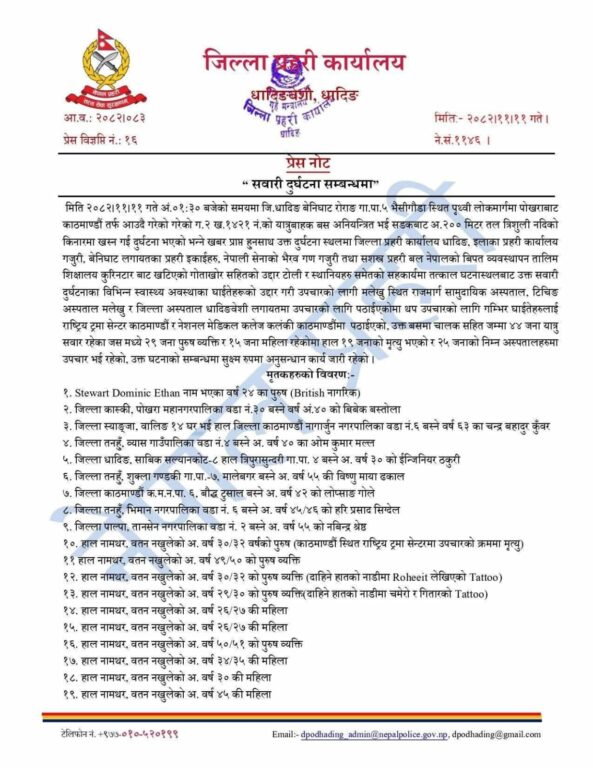 काठमाडौं । सोमबार बिहान धादिङ्गको बेनिघाट रोराङ्गस्थित त्रिशुलीमा भएको बस दुर्घटनामा परी मृत्यु भएका १९ जनामध्ये नौं जना यात्रुको सनाखत भएको छ ।
