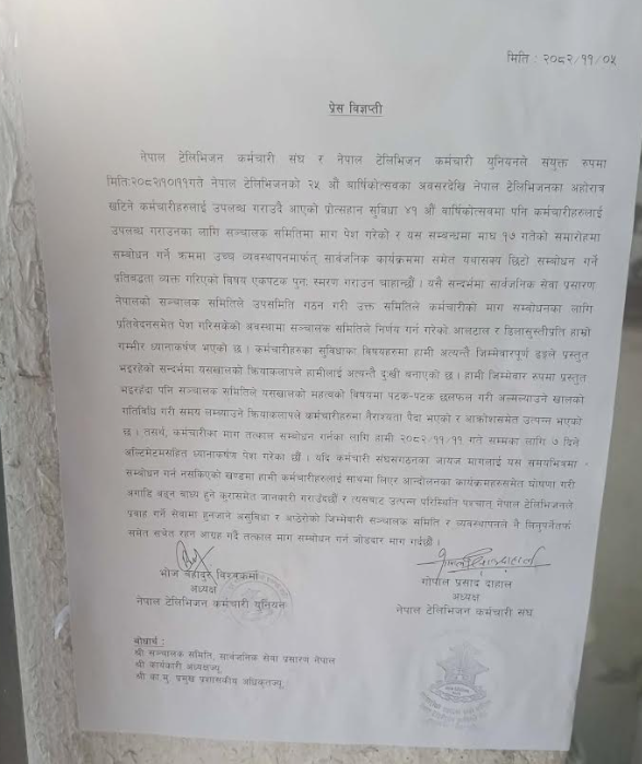ट्रेड युनियनहरूले गत फागुन ५ गते विज्ञप्ति जारी गर्दै सार्वजनिक सेवा प्रसारण नेपालका सञ्चालक समिति, संस्थाका प्रमुख प्रशासकीय अधिकृतलगायतलाई दबाबसहितको चेतावनीसमेत दिएका छन् ।