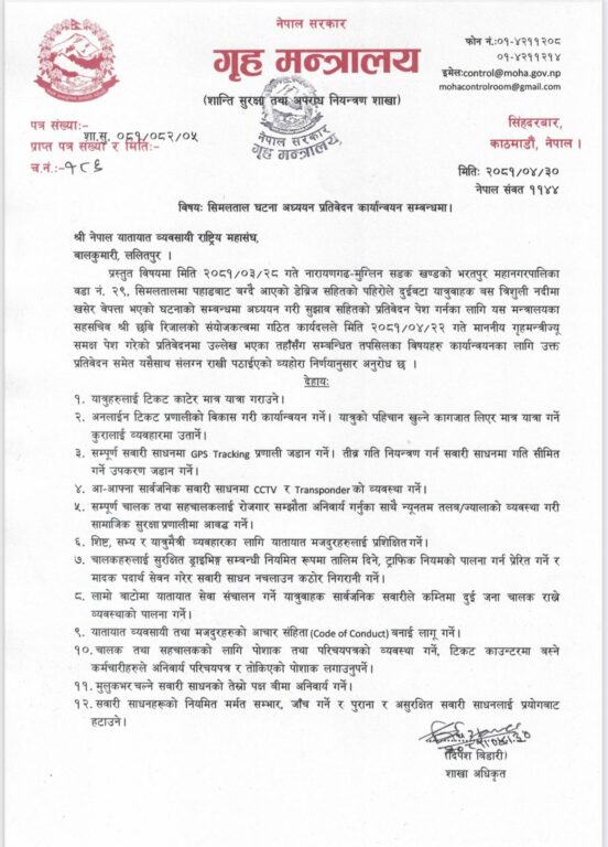 गृहमन्त्रालयले यात्रुलाई टिकट काटेर मात्रै यात्रा गराउने, अनलाइन टिकट प्रणालीको विकास गरी कार्यान्वयनमा ल्याउने, यात्रुको पहिचान खुल्ने कागजात लिएर मात्रै यात्रा गर्ने विषयलाई व्यवहारमा ल्याउने, सम्पूर्ण सवारी साधनमा जीपीएस ट्र्याकिङ प्रणाली जडान गर्ने, तीव्र गति नियन्त्रण गर्न सवारी साधनमा गति सीमित गर्ने उपकरण जडान गर्ने, आ–आफ्नो सार्वजनिक सवारी साधनमा सीसीटीभी र ट्रान्सपोन्डर (भौगोलिक अवस्था, उचाइ र स्थानीय वातावरणबारे जानकारी दिने विशिष्टीकृत डिभाइस) जडान गर्नुपर्ने निर्देशन दिएको थियो ।