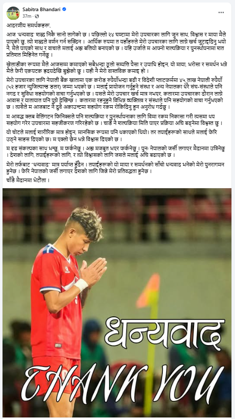 ‘म दृढ संकल्पका साथ भन्छु, म फर्कनेछु । पुनः नेपालको जर्सी लगाएर मैदानमा उत्रिनेछु । तपाईंहरूको यो मायाको साँचो धन्यवाद मेरो पुनरागमन नै हुनेछ,’ उनले प्रतिबद्धता जनाएकी छन् ।