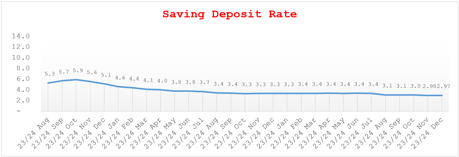 प्राकृतिक व्यक्तिहरूलाई दिइने बचतको ब्याजदर हालसम्मकै न्यून छ (जुन ग्राफमा पनि हेर्न सकिन्छ) । उच्च रेमिट्यान्स प्रवाह र वर्तमान निक्षेपको आपूर्ति तथा विगतको अवस्थाको विश्लेषण गर्दा, हाल बैंकिङ क्षेत्रको ब्याजदर ०.५% भन्दा तल पुग्नुपर्ने स्थिति हो । तर, नेपाल राष्ट्र बैंकले सतर्कतापूर्वक लिएको नीतिका कारण ब्याजदर २.७५% मा स्थिर भएर बसेको छ ।