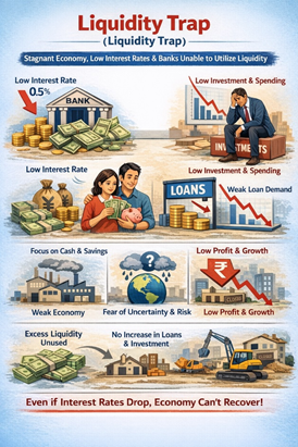 यस्तो अवस्थामा मौद्रिक नीतिमामार्फत जारी गरिने उपकरणहरूले काम गर्न सक्दैनन् भन्ने मान्यता छ र ती मौद्रिक औजारहरू यस्तो अवस्थामा मुख्यतः कमजोर र निष्प्रभावी हुने गर्छन् ।