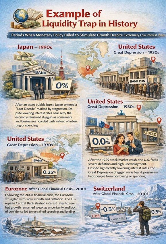 सबैभन्दा चर्चित उदाहरणहरू अन्तर्गत संयुक्त राज्य अमेरिकाको ‘ग्रेट डिप्रेसन’ (१९३०) सबैभन्दा पुरानो उदाहरण मानिन्छ । यस समयमा ब्याजदर अत्यन्त कम थियो, बैंकहरूले अत्यधिक रिजर्भ राखे र व्यक्तिहरूले नगद राख्न रुचाए किनभने मुद्रा संकुचन र आर्थिक अनिश्चितता धेरै थियो । अमेरिकी फेडरल रिजर्भले मौद्रिक विस्तार गरे पनि लगानी र उपभोगमा कुनै उल्लेखनीय वृद्धि भएन । यसले गर्दा सरकारले ‘न्यु डिल’मार्फत ठूलो मात्रामा राजकोषीय खर्च गरेर अर्थतन्त्र पुनः सक्रिय गर्नुपर्यो ।