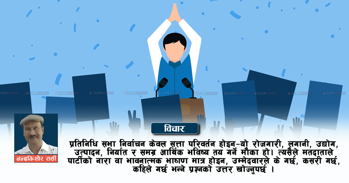 देशको अर्थतन्त्र आज निर्णायक मोडमा छ । दशकौँदेखि समृद्धिको चाहना बोकेका नागरिकहरू बारम्बारको राजनीतिक अस्थिरता, नीतिगत अनिश्चितता र कार्यान्वयनको कमजोरीबाट आजित छन् । यही असन्तुष्टि पछिल्लो समय ‘जेन्जी आन्दोलन’ लगायतका नागरिक आवाजमा पनि प्रकट भयो । यस्तो अवस्थामा प्रतिनिधि सभा निर्वाचन केवल सत्ता परिवर्तन होइन- यो रोजगारी, लगानी, उद्योग, उत्पादन, निर्यात र समग्र आर्थिक भविष्य तय गर्ने मौका हो । त्यसैले मतदाताले पार्टीको नारा वा भावनात्मक भाषण मात्र होइन, उम्मेदवारले के गर्छ, कसरी गर्छ र कहिले गर्छ भन्ने प्रश्नको उत्तर खोज्नुपर्छ ।