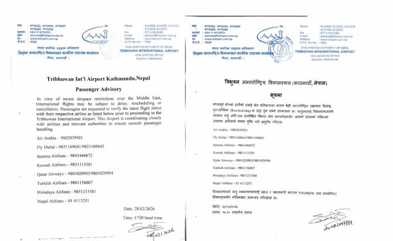 त्रिभुवन अन्तर्राष्ट्रिय विमानस्थलबा हुने उडान रद्द भएपनि यात्रु आउँदै सोधपुछ गरेर फर्कदै गरिरहेको पनि विमानस्थल कार्यालयले जानकारी दिएको छ ।
