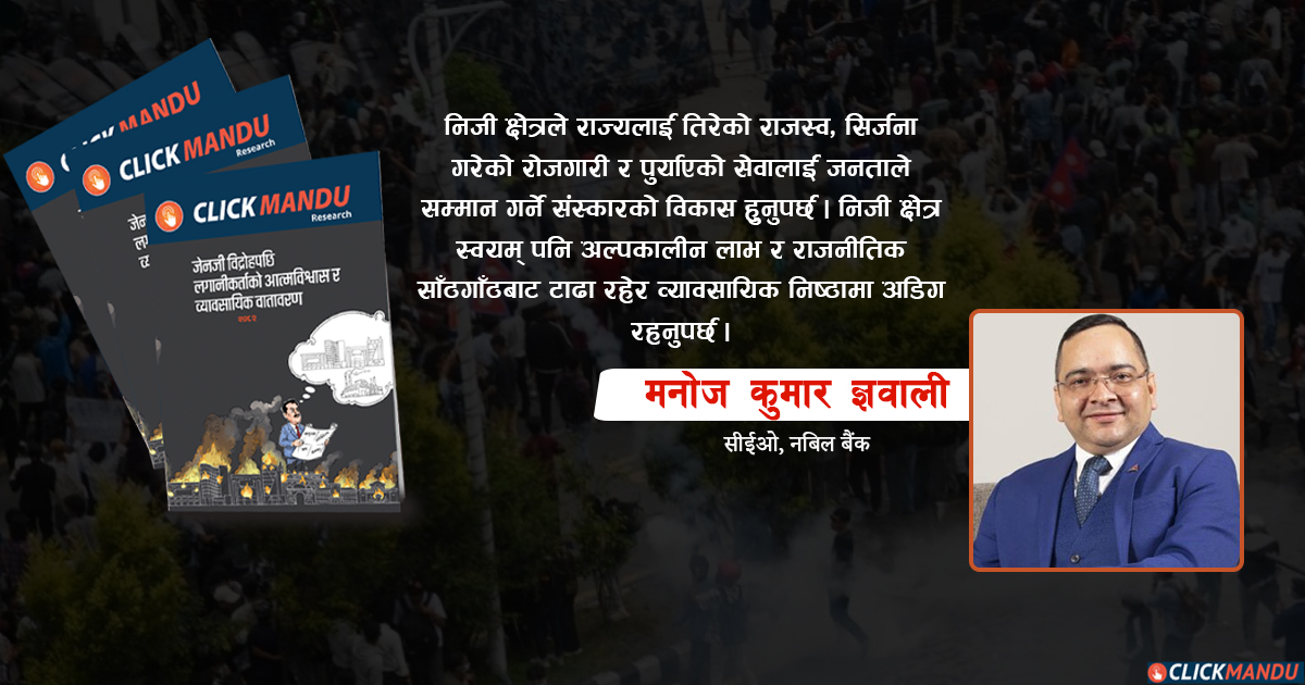 (प्रस्तुत लेख ‘जेनजी विद्रोहपछि लगानीकर्ताको आत्मविश्वास र व्यावसायिक वातावरण’ अध्ययन प्रतिवेदन तयार गर्ने क्रममा सोधिएका प्रश्नहरुमा नबिल बैंकका प्रमुख कार्यकारी अधिकृत ज्ञवालीले दिएको जवाफका आधारमा तयार पारिएको हो।)