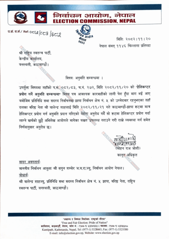 बालेनले यो रुटमा हेलिकप्टर प्रयोग गर्दा लाग्ने खर्च छुट्टै अभिलेख राखेर निर्वाचन आयोगले मागेको बखत उपलब्ध गराउने शर्तमा अनुमति पाएका थिए ।